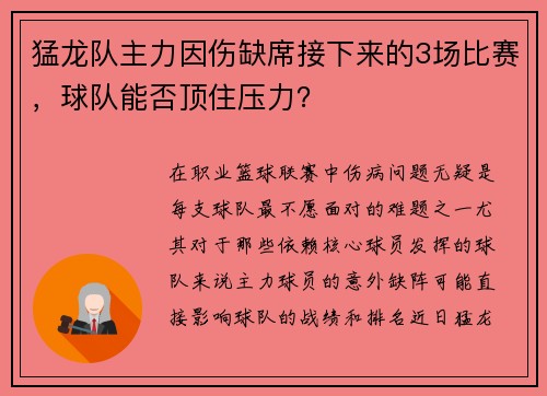 猛龙队主力因伤缺席接下来的3场比赛,球队能否顶住压力?